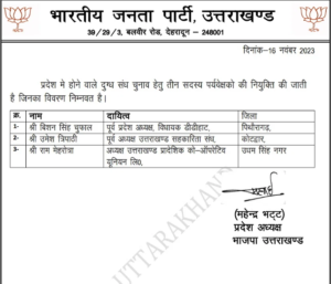 उत्तराखंड भारतीय जनता पार्टी ने दुग्ध संघ चुनाव के लिए पर्यवेक्षक नियुक्त कर दिए हैं।