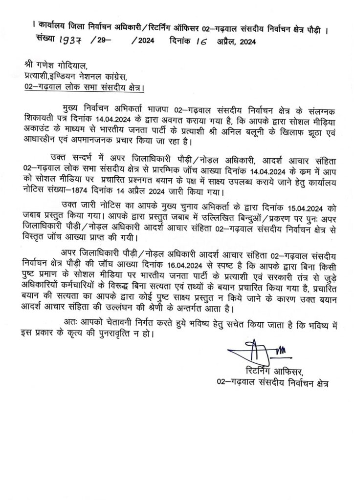 उत्तराखंड में गढ़वाल लोकसभा सीट से कांग्रेस प्रत्याशी गणेश गोदियाल को चुनाव आयोग ने दी चेतावनी, जानें मामला