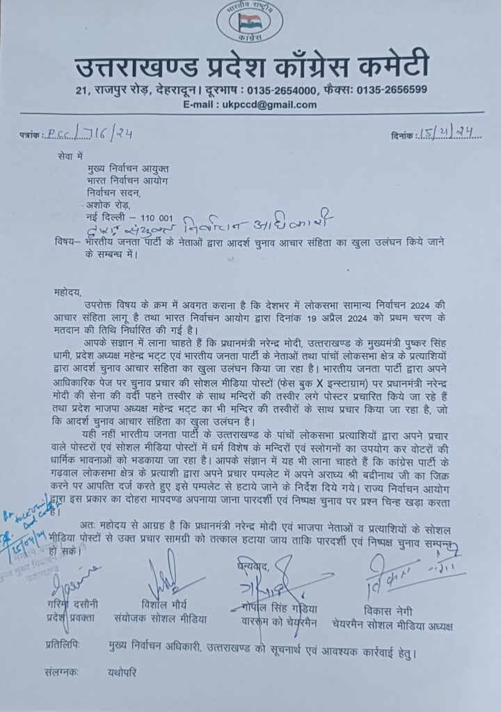 संयुक्त निर्वाचन अधिकारी, नमामि बंसल को सौंपी लिखित शिकायत में कांग्रेस प्रतिनिधिमंडल ने आरोप लगाया है कि देशभर में लोकसभा सामान्य निर्वाचन 2024 की आचार संहिता लागू है और भारत निर्वाचन आयोग द्वारा दिनांक 19 अप्रैल 2024 को प्रथम चरण के मतदान की तिथि निर्धारित की गई है, जिसमें भाजपा नेताओं और प्रधानमंत्री नरेन्द्र मोदी, उत्तराखण्ड के मुख्यमंत्री पुष्कर सिंह धामी, प्रदेश अध्यक्ष महेन्द्र भट्ट और भारतीय जनता पार्टी के नेताओं व पांचों लोकसभा क्षेत्र के प्रत्याशियों द्वारा आदर्श चुनाव आचार सहिता का खुला उलंघन किया जा रहा है।