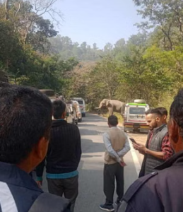 कोटद्वार पौड़ी हाईवे पर दुगड्डा से कोटद्वार के बीच आज सुबह अचानक हाथी आ धमका