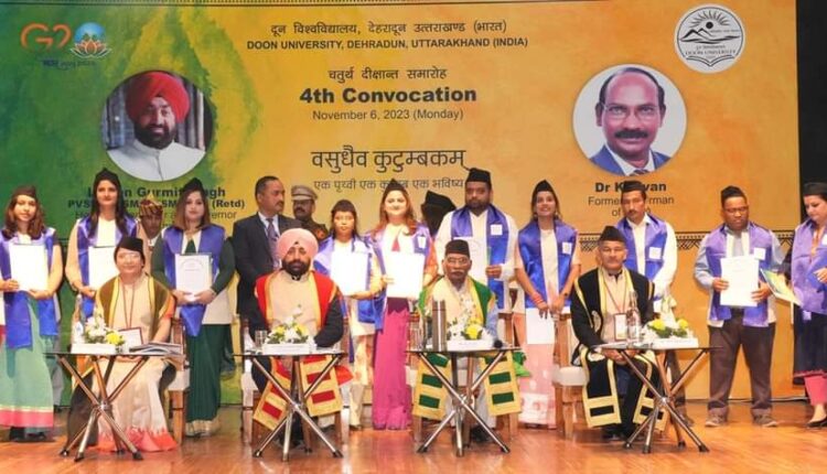दून विश्वविद्यालय के चतुर्थ दीक्षांत समारोह में सोमवार को राज्यपाल लेफ्टिनेंट जनरल गुरमीत सिंह (से नि) ने बतौर मुख्य अतिथि प्रतिभाग किया। कार्यक्रम में विशिष्ट अतिथि भारतीय अंतरिक्ष अनुसंधान संगठन(इसरो) के पूर्व अध्यक्ष डॉ. के. सिवन उपस्थित रहे। दीक्षांत समारोह में राज्यपाल ने विश्वविद्यालय के 34 मेधावी छात्र-छात्राओं को उपाधि और मेडल देकर सम्मानित किया। इस अवसर पर विश्वविद्यालय के भूतपूर्व छात्र राहुल कोटियाल को पत्रकारिता, राहुल त्यागी को लोक प्रशासन, दयाकृष्ण पुरोहित को भौतिक विज्ञान और दिव्यांशा राणा को कंटेंट एनालिसिस के क्षेत्र में उत्कृष्ट कार्य करने के लिए ‘‘डिस्टिंगविश्ड एलुमनाई ऑफ द युनिवर्सिटी’’ के तौर पर सम्मानित किया गया।