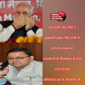 प्रधानमंत्री नरेंद्र मोदी ने मुख्यमंत्री पुष्कर सिंह धामी से फोन के माध्यम से उत्तरकाशी के सिल्क्यारा के पास टनल में फंसे श्रमिकों के बारे में जानकारी ली।