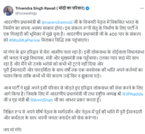 वहीं, पूर्व मुख्यमंत्री त्रिवेंद्र सिंह रावत ने हरिद्वार से लोकसभा का प्रत्याशी घोषित होने पर पार्टी अध्यक्ष, गृहमंत्री शाह व प्रधानमंत्री मोदी का अभार जताया। उन्होंने ट्वीट करते हुए लिखा कि मां गंगा के द्वार हरिद्वार से मेरा आत्मीय नाता रहा है। इसी लोकसभा के डोईवाला विधानसभा की जनता ने मुझे विधायक, मंत्री व मुख्यमंत्री तक पहुंचाया। उनका प्यार सदा मेरे साथ रहा है व मैंने भी उनके भरोसे को कभी भी टूटने नहीं दिया और पूरी ईमानदारी व पारदर्शिता के साथ वर्षों तक एक जनसेवक की भांति अपने कर्तव्यों का पालन किया, ताकि कभी भी मेरे कारण उन्हें सिर न झुकाना पड़े।