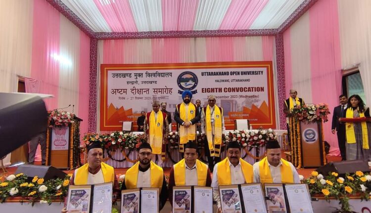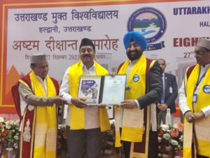 हल्द्वानी/ देहरादून : उत्तराखंड मुक्त विश्वविद्यालय के अष्टम दीक्षांत समरोह में राज्यपाल (रि.) लेफ्टिनेंट जनरल गुरमीत सिंह, मुख्यमंत्री पुष्कर सिंह धामी और उच्च शिक्षा मंत्री डॉ. धन सिंह रावत ने 21 छात्रों को विश्वविद्यालय स्वर्ण पदक, दो छात्रों को कुलाधिपति स्वर्ण पदक और तीन प्रायोजक स्वर्ण पदक प्रदान किये। इसके साथ ही पांच छात्रों को पीएचडी की उपाधि और विभिन्न विद्याशाखाओ में 15417 को स्नातक और स्नाकोत्तर की उपाधि प्रदान की गई। इस दौरान राज्यपाल और मुख्यमंत्री ने मुक्त विश्वविद्यालय के कॉसैप्ट की सराहना की, साथ ही उन्होंने सभी छात्रों के उज्ज्वल भविष्य की कामना की। उच्च शिक्षा मंत्री डॉ. धन सिंह रावत ने कहा कि उच्च शिक्षा के क्षेत्र में राज्य सरकार ने तीन बड़े कदम उठाये हैं जिसमें प्रत्येक छात्र-छात्राओं का अब डीजी लॉकर के माध्यम से डिग्रियां दी जायेगी। दूरस्थ शिक्षा में एडमिशन लेने वाले छात्र-छात्राओं को निःशुल्क पुस्तकें वितरित की जायेंगी। परीक्षा परिणाम समय पर घोषित हों इसके लिये प्रत्येक विश्वविद्यालयों में केन्द्रीय मूल्यांकन व्यवस्था लागू की जायेगी इसके लिये पीएम-रूसा से तहत विश्वविद्यालयों को 20-20 करोड़ की धनराशि आवंटित की जायेगी।
