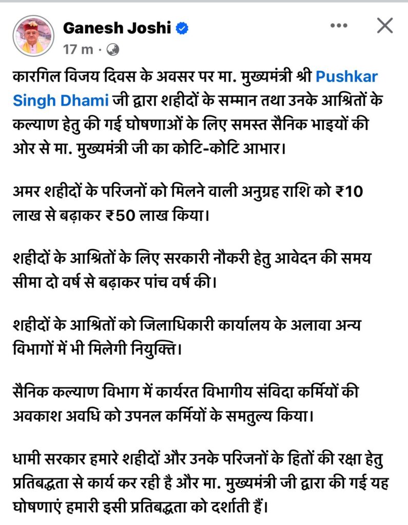 वहीं, सैनिक कल्याण मंत्री गणेश जोशी ने अपने सोशल मीडिया प्लेटफार्म पर लिखा है कि मेरे अनुरोध को स्वीकारते हुए मुख्यमंत्री पुष्कर सिंह धामी ने जो शौर्य दिवस के अवसर पर जो घोषणा की है, मैं उत्तराखंड के सभी पूर्व सैनिकों, वीर माताओं, वीरांगनाओं तथा शहीदों के आश्रितों की तरफ से मुख्यमंत्री पुष्कर सिंह धामी का आभार व्यक्त किया है।
