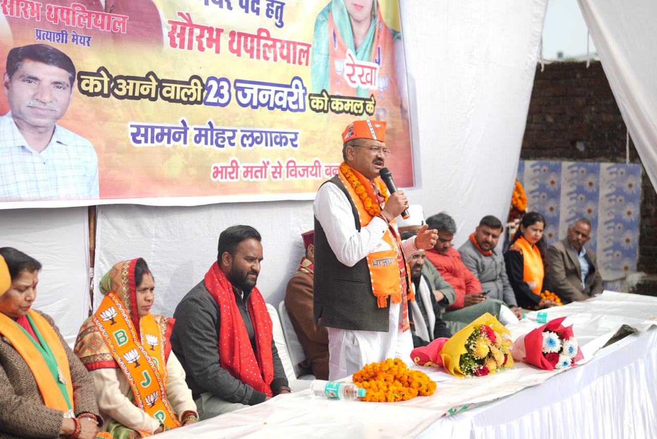 कार्यक्रम में भाजपा महापौर प्रत्याशी सौरभ थपलियाल ने सभी कार्यकर्ताओं और जनता का अभिनंदन करते हुए कहा कि भारतीय जनता पार्टी लगातार समाज में अपनी कई योजनाओं के माध्यम से सेवा करने का काम कर रही है मैं भी आज आपके सामने अपील करता हूं कि आपका सेवक बनकर ही काम करूंगा माननीय विधायक खजान दास के द्वारा आपकी विधानसभा में समाज हित में कई कार्य किए गए हैं और आने वाले समय में भी कई जनकल्याण योजनाओं से लाभ देने का काम करेंगे। देश के प्रधानमंत्री नरेंद्र मोदी लाखों बेघर लोगों को घर देने का काम कर रहे हैं भारतीय जनता पार्टी व भाजपा सरकार लोगों को आशियाना देने का काम करती है ना कि उजाड़ने का। मैं आप सबको भरोसा दिलाना चाहता हूं कि चुनाव के बाद प्रथम बोर्ड की मीटिंग में बस्तियों को नियमावली के अनुसार स्थाई करने के लिए पूर्ण कोशिश करूंगा। हमारे प्रदेश में पुष्कर सिंह धामी की सरकार के द्वारा प्रत्येक गली मोहल्ले को नवीनीकरण करने के लिए कई योजनाओं के माध्यम से लाभ पहुंचाने का काम किया गया है । हमारी मातृशक्ति को कई लाभकारी योजनाओं में लाभ प्राप्त हुए हैं हम सब जानते हैं भारतीय जनता पार्टी समाज के प्रत्येक व्यक्ति के लिए उत्तरदाई है।