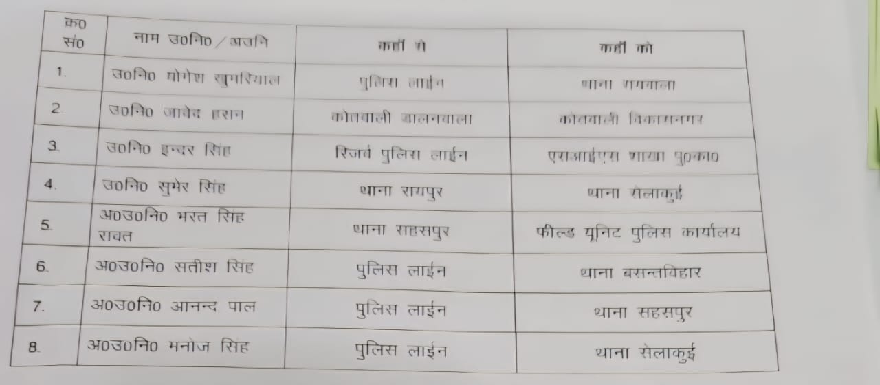 एसएसपी द्वारा जारी सूची के अनुसार लगभग सभी शहरी व ग्रामीण क्षेत्रों में थानाध्यक्षों व चौकी प्रभारियों की अदला-बदली भी की गई है। कैंट, मसूरी, ऋषिकेश, डोईवाला, वसंत विहार, विकासनगर, रायपुर, पटेलनगर, क्लेमेंट टाउन, प्रेमनगर, बसंत विहार, सहसपुर, राजपुर, डालनवाला, नेहरू कॉलोनी, रायवाला, हरिपुर कला, आशारोड़ी, लक्ष्मण चौक, कुल्हाल, आईटी पार्क, जाखन, पंडितवाड़ी, जोगीवाला, हाथीबड़कला, आराघर व अन्य चौकियों/थानों में नए प्रभारियों की नियुक्ति हुई है।
